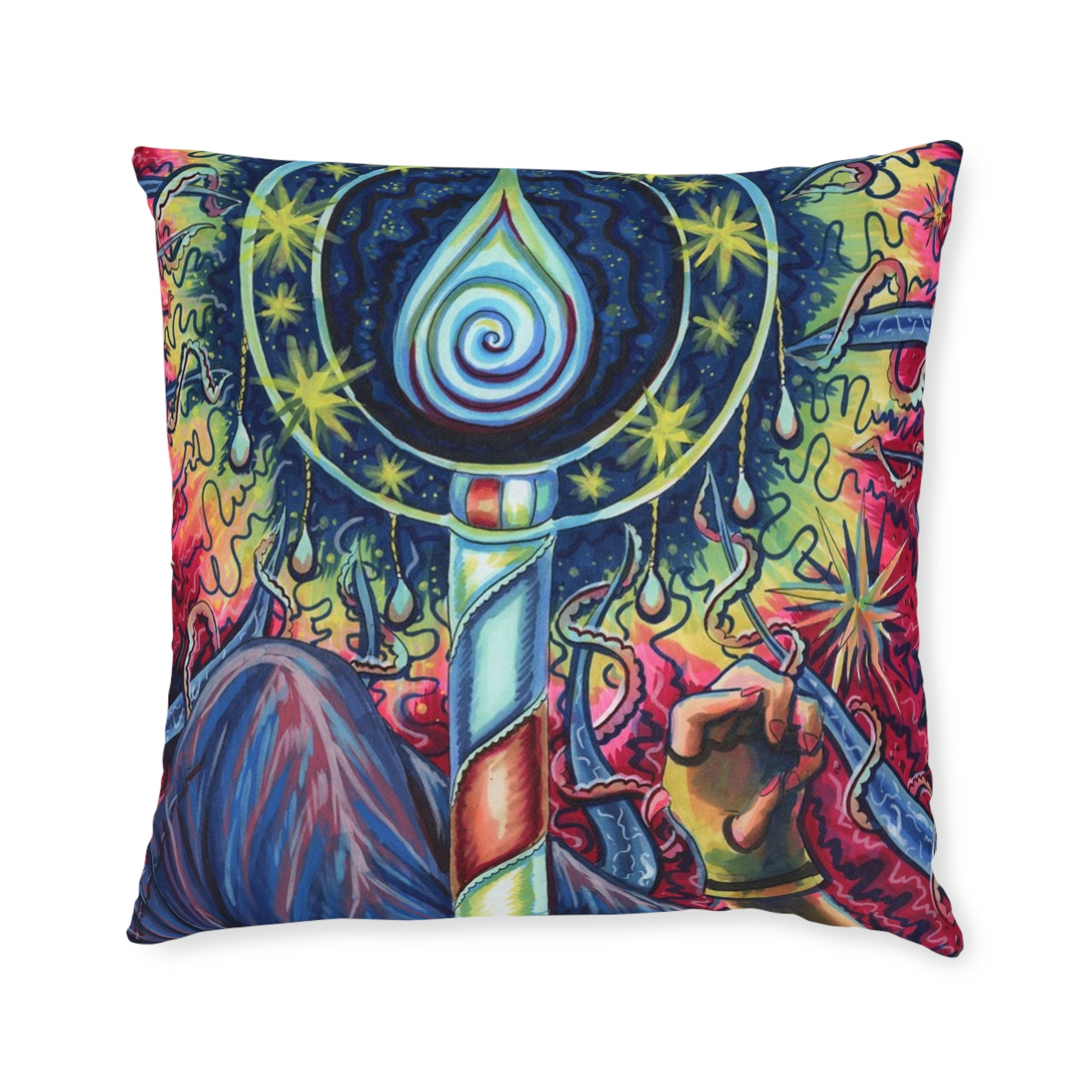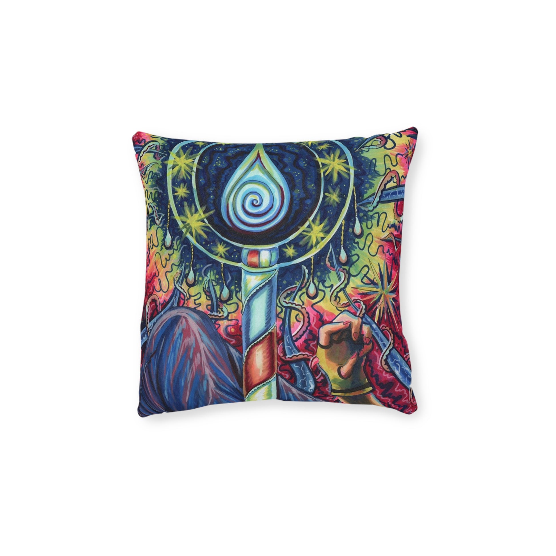 This square pillow brings bold, surreal art into the places you live. Vivid, double-sided prints showcase tangled, otherworldly forms — twisted vines, ghostly faces, and burning, painterly textures — that draw the eye and hold it. The faux-suede cover feels plush and soft against skin while the resilient polypropylene fabric keeps the shape and colors bright through everyday use. A concealed zipper keeps the look seamless, and the pillow arrives ready to layer on a couch, chair, or bed to add mood and conversation to a room. It’s made for someone who loves darkly imaginative decor and wants a tactile piece that reads like a fragment of a strange, beautiful story.