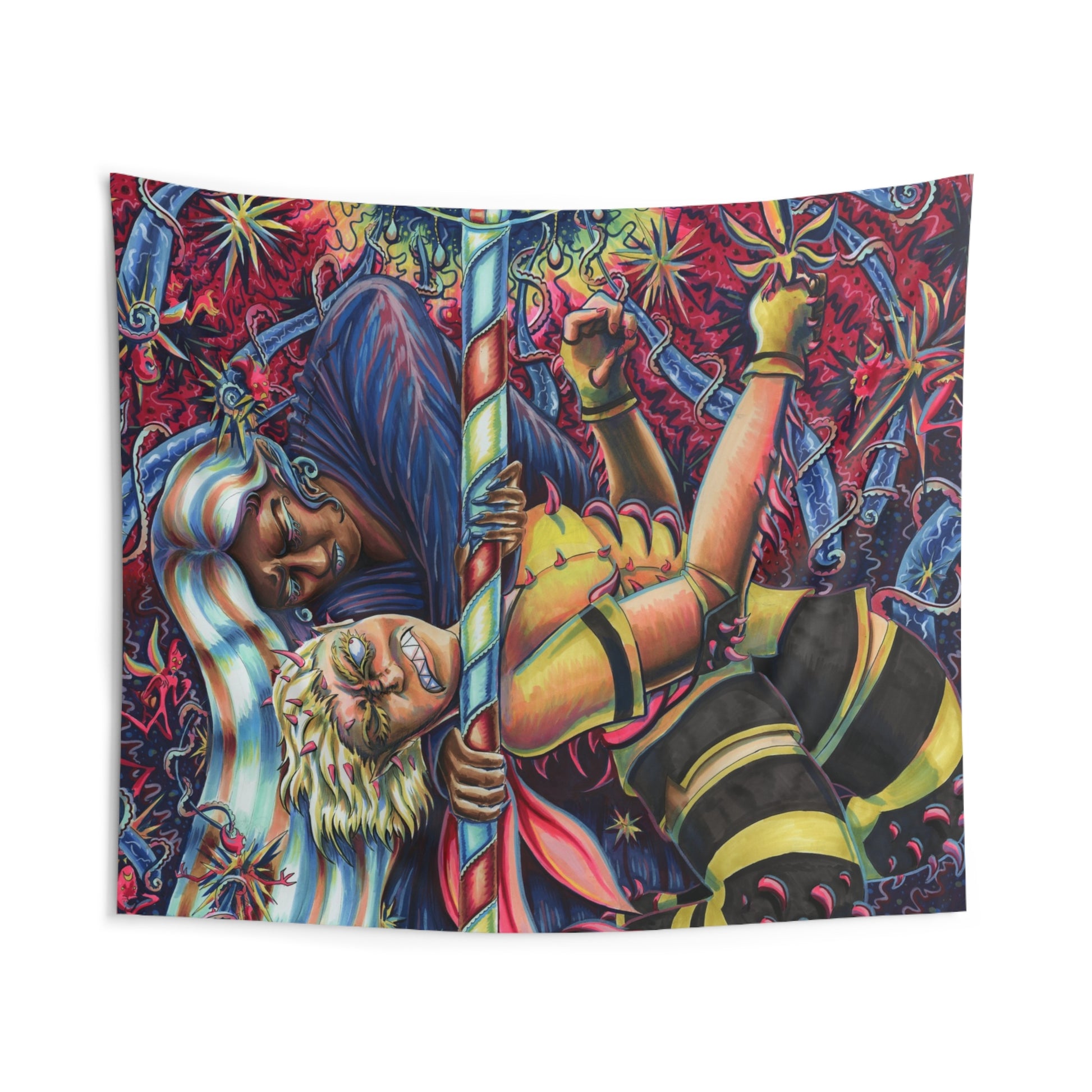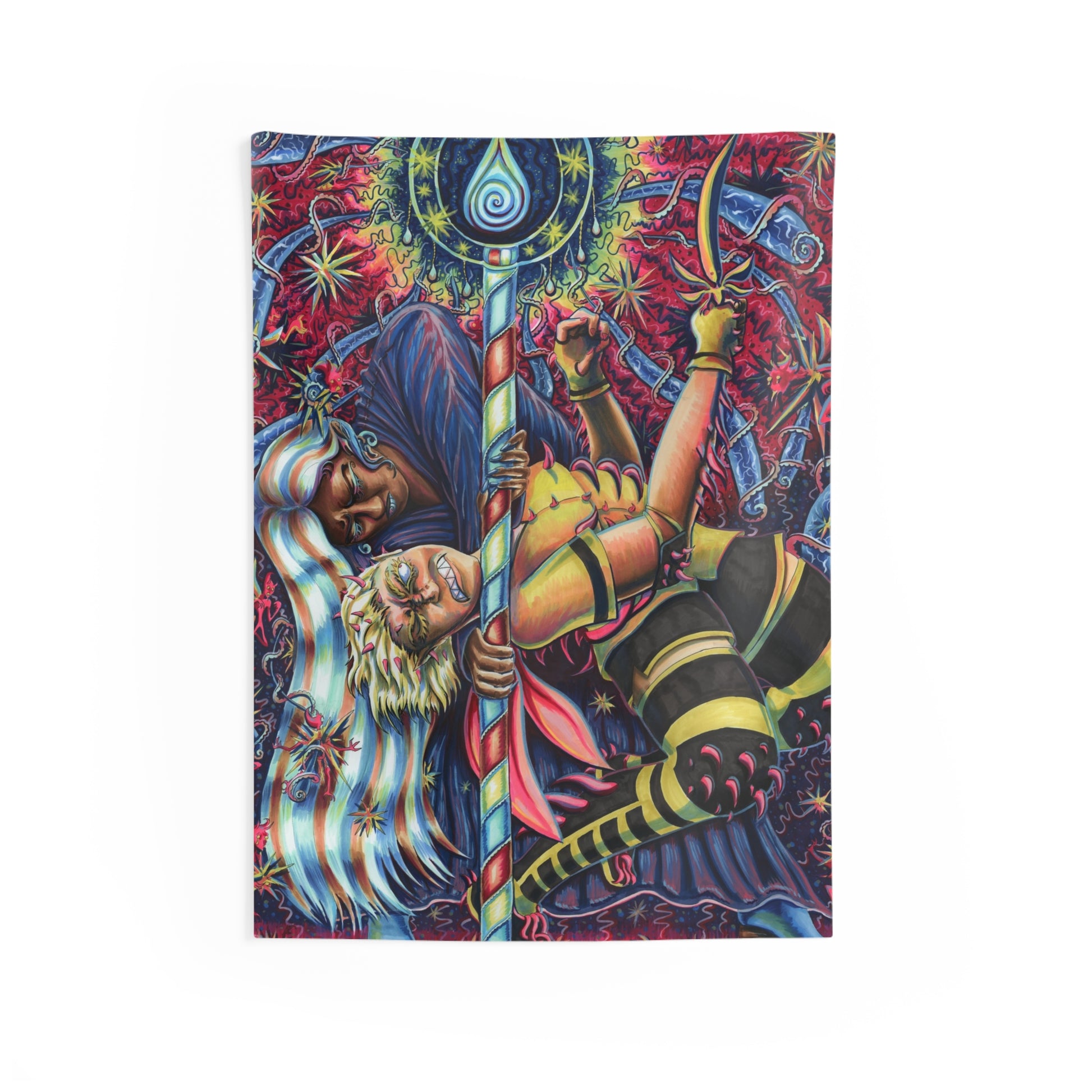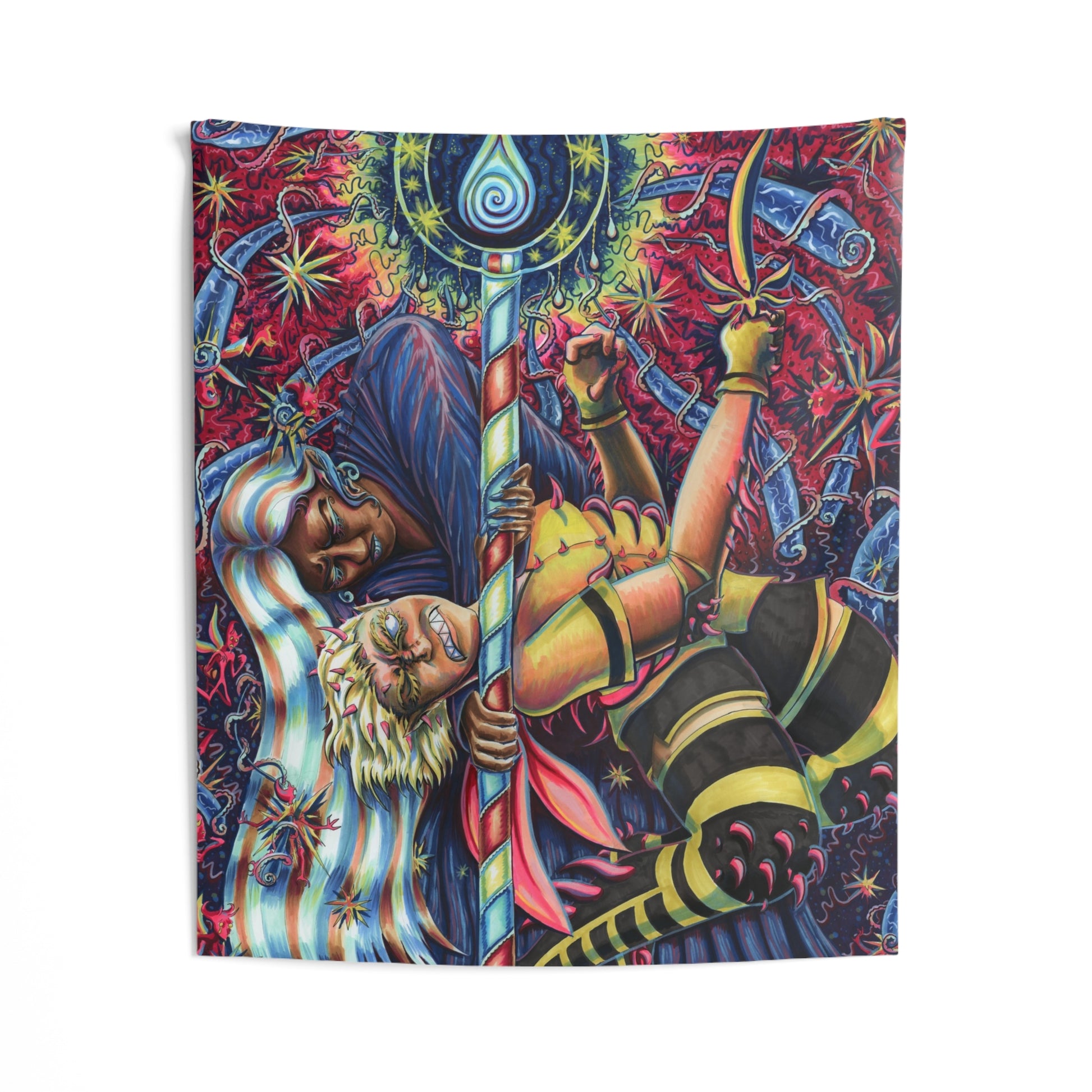 A vibrant indoor wall tapestry that brings bold color and storytelling to your living space. Printed on durable 100% polyester with finely hemmed edges, the artwork stays vivid and the fabric holds its shape and drape. The design pulses with energetic, mystical imagery—dynamic figures, swirling patterns, and jewel-toned contrasts—that transform a plain wall into a focal point. Available in multiple sizes to suit cozy nooks or large feature walls, this tapestry is tailored for adults who love immersive, expressive decor and imaginative interiors.